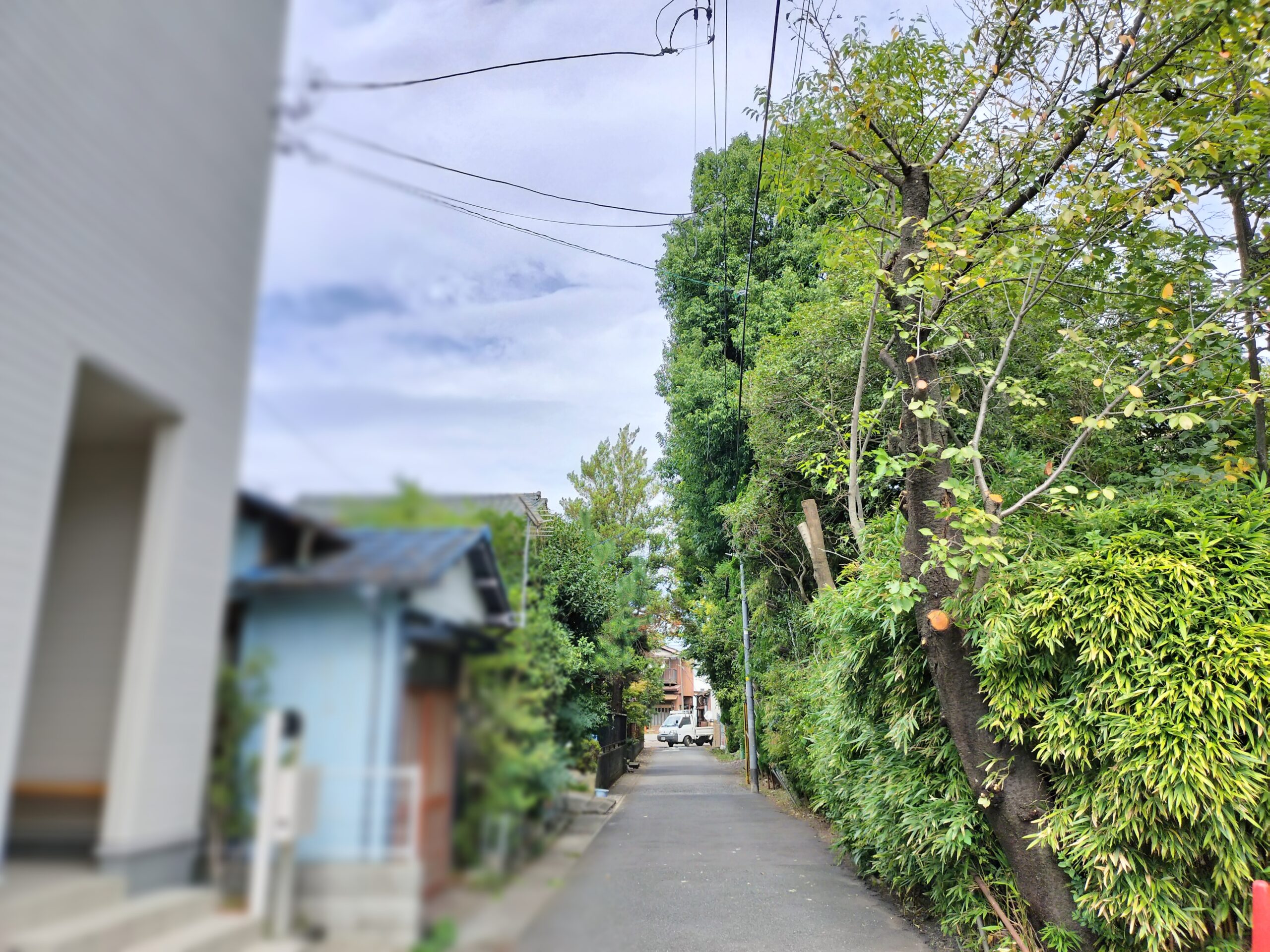 道幅が車1台ほどのため、高所作業車は使用せず、脚立と登り込みで行いました。